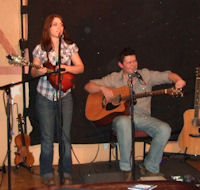 Roberts to take the stage. I hadn’t heard them before and wasn’t sure what to expect; but immediately they launched into their first number “All I’ve Known”, I knew we were in for a good evening. What struck me about this number was the way Jamie played his guitar. He had it laid across his lap, lap slide style, but without the slide. Instead he fingered the notes Appalachian Dulcimer style, and used his right hand not only for plucking and strumming but also for slapping out some percussion on the guitar body. A very effective technique that I haven’t seen before. I seem to remember a blind blues singer learning to play like this, because he had never seen the conventional way to hold a guitar, but that wasn’t the case here – Jamie just used this technique on a few numbers, the rest of the time playing conventional guitar. Katriona, meanwhile, looked after the vocals and violin accompaniment on this number which was one of her self-penned songs. Most of the songs in the set were written, either by Katriona or Jamie and they both took the vocals as appropriate. One song which really struck me was Katriona’s “Travelling in Time” dealing with the difficult issue of short term memory loss and dementia. A difficult subject to tackle, but dealt with in a very sensitive and perceptive way. As well as violin, Katriona also played mandolin. As the first half drew to a close we realised that not only were we listening to a duo of talented musicians but also to a couple of gifted songwriters.