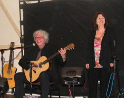 The Woodman kindly presents another opportunity to see the magnificent QuickSilver, and my two sons and I duly jump at the chance. I've been covering a few more of Grant Baynham's songs recently, including the frankly magnificent "First Kiss", from Grant's solo live "Listen..." CD (my advice to you is to Buy One and Be Amazed). I really should get him a pint in for this, and do so, while attempting to convince him that "First Kiss" would stand proudly in comparison with the best of the works of our heroes, mssrs Thackray, Lehrer, Flanders and Swann : but Grant dissembles like a true Englishman and is having none of it. I hope he got the message though. The lights go down and Nothing To Prove are first up, starting with "Voyage To Australia", which has the Woodman regulars scurrying for their shakers straight away. NTP have added an almost prog-rock into to the song, and throughout their set it seems to me that they have become much tighter and musically inventive of late. Derry produces some very Lindisfarne-like bass on "Be My Downfall“ and their last song, “Folk Festival Virgin", has the Woodman laughing out loud. Next on stage is Barry Priest, who plays solo tonight, giving us a lovely "My Temporary Home" and one I'd not heard before, a Jimmy Nail song called "Big River" about the Tyne, both songs sung beautifully, as ever. And then it's time for the mighty QuickSilver, who neither of my boys have ever seen, so it's the start of an evening's treat for them as Grant and Hilary open with "Sing In The Day" : neither of them seem to need much loosening up and are both quickly in the groove. They continue with their arrangement of Jake Thackray's "The Kiss" - Grant plays it in two alternating keys, one to suit each of their voices, complete with intricate linkings between the two keys : neither of my boys have ever seen it played quite like this before, and stare at me in astonishment. QuickSilver aren't going to let up, however, and follow it up with Richard Stilgoe's "La Mer", which has the audience in hysterics and features a beautiful Piaf-esque French vocal from Hilary. Next, Grant introduces "Sabrina Fair", a song about memories of the old Arley ferry across the Severn at Northwood Halt : a gentleman in the seat next to me remarks to his wife that he used to be the ferryman on that ferry ! Grant Baynham is particularly twiddly and fluent in this song, even to the point of fine-tuning his guitar while still playing... There then follows a small chat of Grant and Hillary's recent trip to Canada, leading into a nice boating song, "Owen Sound / Steady As She Goes", which is warmly received by the Woodman crowd. QuickSilver then teach us the chorus to "Not That Old Thing", a splendid ragtime song, during which Grant performs a proper Scott-Joplinesque bass line throughout despite the complexity of the chords : my notes here on his solo just say "fantastic"... and judging by the applause after the song, the Woodman audience think so too. This is followed by "Spencer's Cock", which Grant has included for tonight‘s more folkey audience, purely because it's a 14 verse version of "The Lover's Ghost" not found in the Childe Ballads ! It is, of course, an epic Mr Baynham original, and, as in many versions of "The Lover's Ghost", the hero is set a task to perform. And what a task ! I wouldn't dream of spoiling the surprise by telling you what it is... but the Woodman attendees seem to thoroughly appreciate it. The first half is brought to a rousing conclusion with Victoria Wood's "The Ballad Of Barry And Freda" (a.k.a. "Let's Do It"), with Grant matching Hilary, Northern accent for Northern accent, in tones that would fit in nicely on "dinnerladies". Break time, and I scuttle off to the bar to recharge the Jeffrey provisions, and to have a chat with Rob O'Dell, the "new" recruit in Nothing To Prove : it's the first chance I've had to talk with him at length since he joined the band and in my opinion it has been entirely positive. Wandering over to the QuickSilver merchandising area, I learn that there is a new QuickSilver CD currently being made, but there, ready to buy, is that rarest of things, a new Mrs Acroyd CD, which I eagerly snaffle up (and have since been mining for new material! ). The raffle is drawn, and Hilary Spencer wins it herself. Ah well ! Part The Second, then, and QuickSilver open with Flanders and Swann's splendid "Have Some Madeira, M'Dear", a salutory warning concerning men with beards. Following that, having to correct the tuning of his guitar after only just starting, Grant tells us some of the history of it (it's a Russell Wooton hand-made guitar), and then goes on to explain why he's always used non-standard chord shapes. Turns out that his index finger, the one you or I would normally use for barring with, is so double-jointed that it doesn't really have the strength to hold all the strings down : accordingly, Grant devised his own family of chord shapes which allow him to play all types of G chord - minors, 7ths, susses etc - with minimal fingering changes (which he then goes on to demonstrate at impressive speed). Fascinating to learn about : though at the same time, I thought that the phrase "He might as well have written it in Chinese Braille, in code", a line from Grant's own 'Y420Q/A', was suitably appropriate ... :o) Next up is "Blue Lagoon Café", a song featuring such a fabulous walking bass line from Mr Baynham that my sons and I exchange incredulous glances : this is followed by a folky "Michael On The Moor", played with a most Carthy-like tune, picked around open strings in a most skilful and controlled manner. One rhyming of "handsome" with "prince's ransom" evokes a big shared grin between Grant and Hilary... as does their effortless interplay in the next number, "Promise Tonight", which brings smiles to all of the audience. "Fred Gittings" is the next song, featuring a rousing chorus (If I had all the money I've spent on beer... I'd spend it on bee