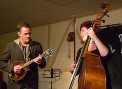 enjoyed one of the best nights’ entertainment I’ve had for a good while. Unusually for the Woodman they opted to do the entire evening totally acoustically and performed in front of the stage to be closer to the audience. All the instruments cut through beautifully and from where I was sat the voices were loud and clear also, but I must admit that for some folks, positioned on the sides or further back, a little amplification of just the voices might have helped. Having said that, we were treated to a stunning performance from two absolute masters of their craft. Miranda has a beautiful, pure, crystal clear voice and is equally at home performing gutsy, jazzy numbers, wistful ballads or the kind of folk songs that we’re more used to at the club. To be honest, I think I would have been thoroughly satisfied if she’d sung her way through the phone book! Rex has not been singing for as long so the lion’s share of the vocals was left to Miranda however the few he did sing, he performed excellently and they harmonised beautifully on quite a few numbers. Instrumentally they are both…..well, brilliant just doesn’t do them justice. Rex was listed in the club diary as being a virtuoso mandolin player and if you were there and saw them last night, you can’t fail to agree that the accolade is well deserved. He also used his recently re-set-up bouzouki on a few numbers and was obviously having the odd tuning problem with it, but again it sounded fabulous once he started picking. That’s the trouble with these cheapo instruments!! (With apologies to Phil Davidson). Miranda is a simply stunning exponent of the double bass and, as any bass player will tell you, it is nowhere near as easy to sing and play bass as it is to accompany yourself on other instruments, but my goodness, she has really nailed it! During the evening she also picked up her guitar for one number and her ukulele for the encore and proved that she’s no slouch on them either. Highlights of the night for me were, ….well all of it really, but if I had to pick out a few; they opened with their version of the Slaid Cleaves song ‘One Good Year’, a hauntingly beautiful rendition of this country song and treated quite different to the original version but equally superb. Kate Rusby’s ‘Old Man Time’ and Karine Polwart’s ‘Only One Way’ couldn’t be more different, the first a beautiful ballad and the second a really punchy, jazzy song but again both of them were delivered with such confident skilful vocals and playing – breathtaking. Another show-stopper towards the end of the night was ‘Me And My Sister The Moon’, the second of two songs written for them by a recent club visitor, Boo Hewerdine – the first was ‘Window Box’. I could go on and on (well I suppose I already have, really), but to my taste, it really was a fantastic night and we must, Must, MUST have them back again. Thank you both. Must just mention that they were ably supported by club regulars Paul & Sue Mathews (Velvet Green), Dick Woodhouse and in the second half John Langford. |