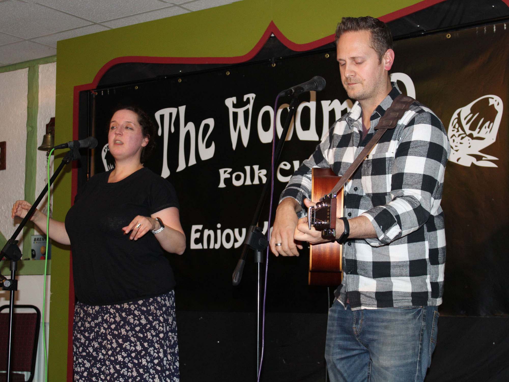 the Woodman Folk Club. The evening began with a set from club stalwart Dick Woodhouse. He was actually announced as a local act, which, since he hails from the North East of England and lives currently in Birmingham (which is definitely not in the Black Country) could give rise to some dispute, but perhaps this is not the time to raise this. Anyway, the still relatively recent practice of giving support acts more “air time” was taken advantage of by Dick who performed a very entertaining set. He began with Jez Lowe’s Old Bones followed by the more light hearted traditional song Friar In The Well, the guitar tuned to DADGAD for both. A quick guitar change, and we were treated to three Jake Thackray songs in a row. The Jolly Captain -The only song I know that contains the word Vexatiously; The rather cheeky Bantam Cock and Jumble Sale. These gave way to Streets of Staithes written by Barry Slater and recorded by the late Vin Garbutt, a song chronicling the demise of the fishing industry. Just when I thought he had finished he brought out his ukulele, school cap and tie – genuine he says – to complete his set with Roaring Jelly’s Valerie Wilkins. The audience and Tu-Kay & Ryan were left in stitches. Tu-Kay & Ryan, whose debut at the club it is comprise Ash Tu-Kay – who’s name is really Woodward - adopted an old nickname as they both felt that Woodward & Ryan sounded more like a firm of solicitors, live in Northampton. They were both seasoned entertainers when they got together in 2018 and have been performing and writing together ever since. They are amazingly prodigious song writers and whilst the Covid lockdowns put paid to gigging it gave them the chance to amass a catalogue of 80 new songs. So enthusiastic are they that they enter online song writing competitions such as the challenge to write 14 songs in the 28 days of February; including having to write and record a song on a set subject in one hour. Musically they are an amalgam of Americana, roots, and folk, producing beautiful harmonies for their wonderfully crafted songs; which they said try to encourage a positive outlook on life even when times are difficult. Their on stage presence is a fine balance between Ash’s “sensible” explanations of song and stories and Rebecca’s “bubbly” interjections and sometimes off-the-wall comments. She never seems to remain still for long, enhancing the songs with hand and arm gestures and it seems constantly moving her feet – something which she claims a way of achieving her Fit Bit 10.000 steps. She is also adept at picking up on audience reactions and bringing them into the performance. They both showed sincere appreciation the audience contribution and encouraged more. It is not possible to capture the enjoyment musically and comically which grew over the course of the two sets but listing the songs they sang may help in part: • Moving slowly – inspired by Ash having grown up near to a canal, about stopping and noticing what is around you • Fateless Bend – is about overcoming the end of a troubled relationship. The song itself had several false endings which brought about applause which itself started and ended abruptly. • Getting It On – was, we were told, not about what you were thinking but about dancing. But was it? • Borderline – “You’ve Got To Let It Go” it seems. • She’s A Dreamer – but there is no need to dream if you live in real time. • Anyway I Can – written on a Cornish holiday after Rebecca had broken her ankle. Have you ever tried to walk up and down Cornish streets etc with a huge boot on your leg. Ash or so we are told was her crutch. This was the first of the songs to feature percussion accompaniment from the audience, even much to Rebecca’s amusement, downloading electronic percussion on mobiles. There was more to follow. • Safe From harm – completed the first half. Following the obligatory raffle – In which I won a duo cd by the way – we launched into the second half. • Stormbound – is another chorus song with more percussion. • Passage Of Time – followed as time does. • Never Grow Up – featured the titles of more nursery rhymes than I could possibly list here. • Carve – written in February for the aforementioned competition is about Rebecca’s relationship with her mother. • Temporal Drifter – brought a competition for the audience. “What song does this remind you of?” Scarborough Fayre said birthday girl Gill, for which she won a cd. • The Little Things – brought complete chaos. It started well but when Rebecca introduced animal noises to complement those creatures mentioned in the song, the audience couldn’t help joining in. All was completely lost however when Chris Irving’s “Baa” in completely the wrong place caused the duo to corpse and even now I’m not sure if the song was ever finished. • Once they recovered the er was a superb “jazzy” number which I failed to get the title of, but it did demonstrate the flexibility of Rebecca’s voice that she can sing such a range of songs. • Sing It Loud – had the audience singing loudly in the chorus. • A Little Time – Ash’s favourite of their songs was inspired by the writers her admires. Joni Mitchell, James Taylor, and Paul Simon to name but three. • This was announced as their last song, but of course it wasn’t because the audience yelled repeatedly for more. • The evening was finally brought to a close with Echo – which ironically was the first song they ever wrote together. This may have been Tu-Kay & Ryan’s first visit to the club but if this evening is anything to go by it may not be the last. And so, another evening came to an end and the audience wended their way home to return another day. I shall conclude as normal by saying A Wonderful Night Was Had by All. Here’s to The Next One. * Notes taken by Les Jones, who also typed up the review, but the views expressed are those of Woody