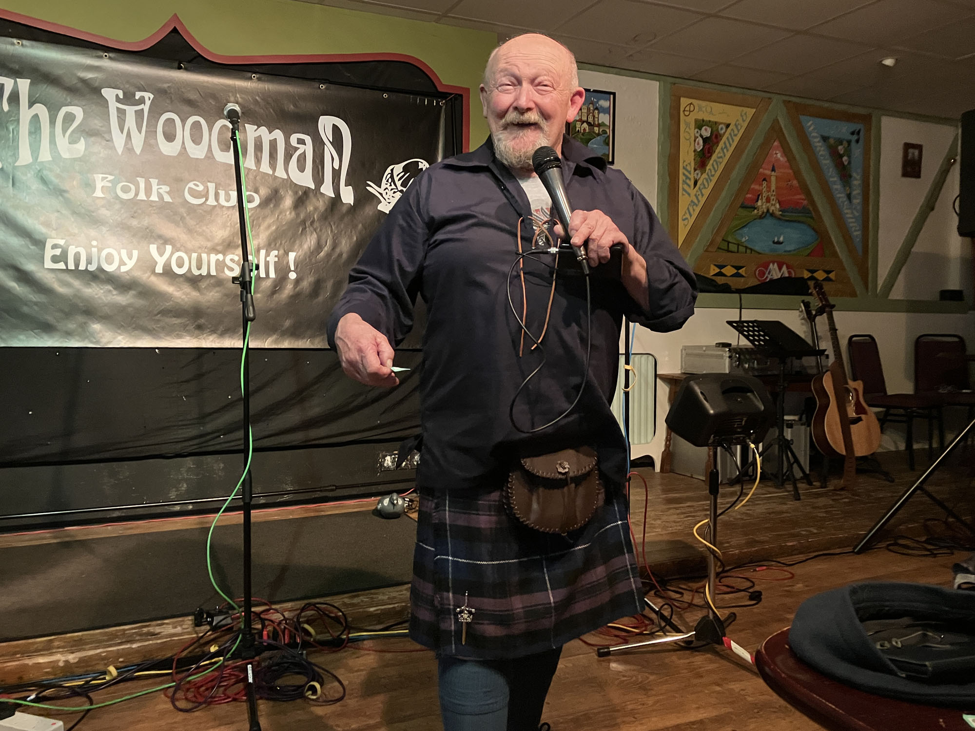 May 2022: Chris Irving wearing his kilt whilst MC'ing for Dave Gibb |