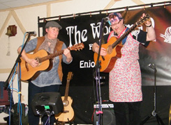 number sum up the evening? Well no .... This is the second visit as guest artists to the Woodman for Steve Hicks and Lynn Goulbourn, and I was particularly keen to see them as I had missed them the last time they came. Having played one of their albums on Spotify and watched a couple of their videos on YouTube I was particularly looking forward to "Keep Your Lamp Trimmed and Burning", and they didn't disappoint with this number being third on their set list. This is an old gospel number associated with Rev Gary Davis and was popularised in the 70s by performers such as Wiz Jones. Hicks and Goulbourn gave it a rather special treatment which came not only from Steve's immaculate guitar playing and Lynne's exquisite vocals, but also from Steve's accompanying gruff vocals which gave the song a real bluesy edge, bringing to mind early Blind Willie Johnson, who also performed this song. There were other blues numbers in the set, such as the classic "Deep River Blues", but if anything the overall feel of the evening veered more towards country music with a bluegrass feel to it. But it would be wrong to try pigeon hole them. As well as the blues, gospel and country music, there was also some jazz, classical guitar, self-penned songs, unaccompanied singing and of course, comedy. Their style and performance is unique. One of the good things about a very varied performance such as this is that you get to hear music from various sources. For me, one of the treats of the evening was Jonathan Byrd's "Jesus was a Bootlegger" with the line "Jesus turned the water into wine, wouldn't that make him a bootlegger too?" it's a line that sums up the clever backwoods logic that permeates a lot of the best country songs. Most of the vocals were taken by Lynn with backing vocals from Steve, but Steve's vocals on John Renbourn's "So Clear" were particularly notable. The gruff blues voice had gone, and from the first few notes, it was almost as if John Renbourn, who sadly died last year, was back with us. It made the song particularly moving. As well as the memorable guitar playing, the singing and great selection of songs, there was a lot of good humour, comedy and audience participation. The first half finished with Lynne singing "Secret Tree", with about a dozen (pre-primed) members of the audience getting up to do some impromptu Morris/barn dancing. They also managed to get everyone providing an "Uh-Huh" accompaniment to Stewball and ended the evening with a near perfect rendition of "Moon River" by the Woodman ensemble, who were in excellent voice, aided by some first rate miming from Lynn. It's the sort of evening that you remember and, depending on your interests, you will take away something that made the evening particularly memorable for you. It could be: - Lynne's wonderful vocals and infectious humour - Steve's amazing guitar playing - The blues and country songs - The audience participation or maybe for you it could be that surreal moment when Lynne dressed Steve up in rollers and a pinny. Support was provided by the Woodman regulars, "Nothing to Prove", Dick Woodhouse and Bryn Phillips. |