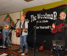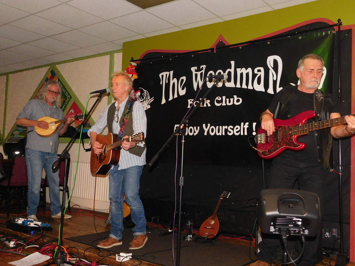 was looking forward to finding out. They started off with a blues standard “Careless Love”. This was played with a steady driving Rockabilly rhythm that just pulled me in. I was immediately drawn to the guitar work of Simon Othen. He was playing slide, but also doing a lot of fingerwork on the frets, which is unusual for a slide player. Talking to him later he confirmed my suspicion that he was playing slide in standard tuning – quite an accomplishment which requires precision and expert damping of the strings. Later he switched to mandolin for a couple of numbers and then back to slide guitar. Des Horsfall played regular guitar and provided the main vocals with Chris Turner on bass and backing vocals. The bass playing was impressive. He didn’t just pick a steady rhythm but also kept throwing in some fast licks. I was loving it. They followed this up with, “Long Long Time” and then Des put on his harmonica stand to play a self-penned blues number “Hard Woman”. This started off with just Des on guitar and harmonica and then in came Simon on slide guitar, followed by Chris on bass to give this blues number a satisfyingly full sound. The set continued with a mix of material including some of Ronnie Lane’s songs including “Done This One Before”, “April Fool” and “Oh La La” and also including some original Des Horsfall numbers, “Whistle to Blow” and the rockabilly styled “I Know a Little Bit About A Lot of Things”. I’ve mentioned Rockabilly a couple of times whereas Des Horsfall has described their music as Rustic Rock ‘n’ Roll which is as good a description as any for some of the numbers; take your pick. As the set progressed I heard some Notting Hillbillies, Travelling Wilburys and old time jug band influences pervading the music and overall I thought the best description of them was as a Country-Rock-Blues band comprising three accomplished musicians, having a good time, and playing their favourite songs, many of them by Ronnie Lane. Most of the tracks in their first set came from the two albums so far made for the Kuschty Rye project with a third on the way. Interestingly they only had one copy of The Bastard’s Tin with them, but they had a whole heap of “The Good Gentleman’s Tonic which they had piled up on the table, rather than neatly laid out as most acts do. Des confided to the audience that CDs sell better if they are heaped up, as people see them as candy and can’t resist buying. So there’s a tip for you musical entrepreneurs – just throw your CDs in a heap! The second set opened with what for me was the best song of the evening, “The Stone” another of Ronnie Lane’s songs with excellent lyrics, clever phrasing and a powerful driving rhythm that carried it along through the various incarnations in this powerful song. If you missed the evening or want to re-live this number it’s worth checking out their video of this piece. Just search for “The Stone + Kuschty Rye” on YouTube As in the first set there were other Ronnie Lane songs “Richmond Green”, “How Come”, “The Poacher” and “Debris”. Once again we had a couple of songs penned by Des, “No-One Talks” and “Wild Ideas”. “No-One Talks” was performed towards the end of the evening and the audience were encouraged to sing along – which of course they did! I think the audience had been waiting for the opportunity all evening as a lot of the numbers would have lent themselves to it. Once the band saw we were up for it they “finished” with the old favourite “Dead and Gone”, the second McGuinness Flint number, having earlier treated us to “Malt and Barley Blues”. Of course there was an encore, and they ended with “Wild Ideas”, which again we joined in with. It’s worth mentioning that Simon Othen, a guitarist in the Woo Town Hillbillies, was called upon to do this gig at the last minute as the regular guitarist had been unable to come along because of illness. Although he had played with Des previously it is quite a thing to come along at short notice and fit in, which he did, remarkably well. As always support was provided by Woodman Residents. This time John Hoare and then Bas & Cos did an excellent job of getting the evening going and I did a couple of songs to start off the second half, before the raffle. |