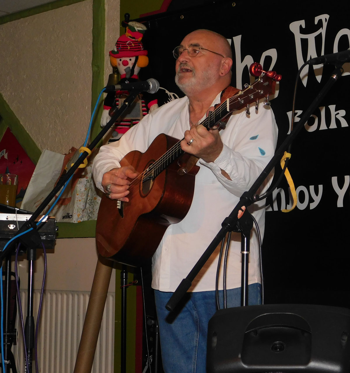 later. It is exactly a year to the day since his last visit and his 11th in the last 20 years. I also noticed from my lofty perch that as usual he encouraged several new visitors to come to the club just to see him. Mike has “been in the business” since the late 1960’s and has the unique record of being the first solo artist (apart from the man himself) to sign for Elton John’s Rocket Records in 1973. He is a consummate guitarist who puts so much skill and feeling into what he plays. I could listen all night just to his playing. His songs are exquisite, beautiful tunes and meaningful lyrics on all manner of subjects. That said – it was one of those nights when not everything went to plan; the occasional lost of lyrics; a guitar that refused to tune and an announcement of the wrong song at one point. This was where his true professionalism showed through and all was smoothed over making a bit of fun out whatever it was. Despite being a prolific songwriter himself he sang several songs by others – One Too Many Mornings/Bob Dylan; Paris and The Amber Room/The late Ewen Carruthers with whom Mike wrote two songs. The second The Power he also sang. In the first half he sang Jackeroo – which if I have this right he wrote about Martyn Wyndham-Read who at the age of seventeen emigrated to Australia on his own and found himself at the end of his journey in an outback town all alone. In the second half he sang one of Martyn’s songs Cock of the North for which he had put the words to lyrics written by the wife of an Australian fisherman. Late in the second he was joined on stage by his wife Julie. It was here that the always reluctant Julie was encouraged to announce the song John Condon only to find that it was not the right one. Nonetheless she handled it well and they went on to start with the Brad Paisley song Whisky Lullaby; John Condon and the aforementioned Cock of the North. They made a lovely duo. Throughout the evening we were treated to any old favourites; When The Spirit Shakes The Tree; Jack Dances; JCB; Never Too Late; The Devil’s In The Detail; and the wonderfully moving Pretoria; plus, a brand-new song How Much Is Enough, a phrase Mike picked up somewhere, possibly from his dad. The much-wanted encore-Not A Matter Of Pride- was the cause of the problems with the untunable guitar; causing him to have to change it for another. Good job he had brought four with him. He finished to rapturous applause. And quite rightly so. I should also mention the wonderful support provided by Velvet Green, Baz and Coz and of course “Your MC for the evening and a wonderful songwriter in his own right” Bryn Phillips. So, here’s me, Woody, signing off for this time. And as usual; A wonderful night was had by all, here’s to the next one. * Notes taken by Les Jones, who also typed up the review, but the views expressed are those of Woody, the club mascot. |