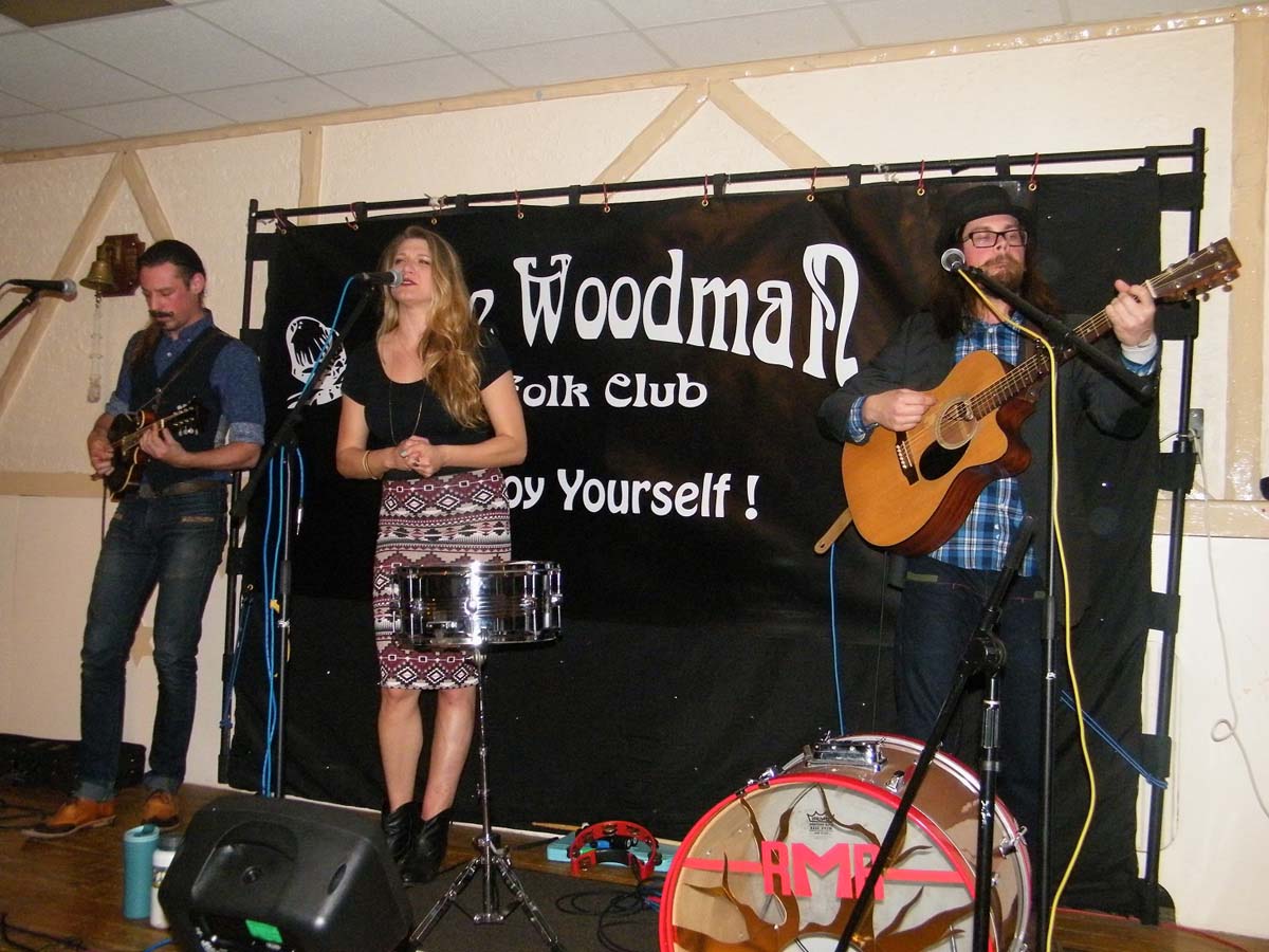 it was to say the very least packed out. To start the evening we listened to regular members Velvet Green, with their lovely rendition of "Margarita" and I believe a self penned song "Song for Larry". This was followed by Dick Woodhouse with a Jake Thackray number "On Again, On Again" which had us all rolling with laughter, then a sad song leaving a few tears, being a fitting tribute to Anzac Day, Eric Bogle's "And The Band Played Waltzing Matilda". Then to the star act of the night "RED MOON ROAD" all the way from Canada yet feeling like part of us, from the moment they started they had us in their hands,... was it the carefully crafted songs? or was it the intimate story telling, I just don't know, but what I do know is that everyone in the room appeared to be enjoying themselves. The band is made up of Sheena Rattai on vocals and percussion not forgetting also the Kazoo, then the two Daniels,.. Daniel Jordan on vocals guitar and mandolin and percussion, Daniel Peloquin-Hopfner on vocals, mandolin, banjo and guitar. All great musicians/artists in their own right but more than just that, really lovely people. We listened to various songs, happy, sad and thought provoking. However, what made the songs even more special was the lovely story telling and explanation for each one, these stories were at times very personal to each of the artists and some ran way back in their own family history, this gave us an understanding of each of them, as already said lovely people. To name just a few of these there was "Demons", "Sailor song", "Do or Die", "Private Love", "Mighty glad you came", "Seasons", "Breathing Slow" and "Why have you left the Ocean". We also had a beautiful rendition of a Beatles number "In My Life". The harmonies were just wonderful along with the silky clear voice of Sheena and the uncompromising musicianship of the two Daniels. Let's all hope they can come back sometime soon. Our compere was our own Bryn Philips; Bryn also treated us to two numbers half way through the evening these were "Dante II" and "Sat Nav Sally". As usual these were self penned by Bryn and were also true stories. Sat Nav Sally being a peach; we are however a little worried that Bryn may start sleeping in his car!!. |