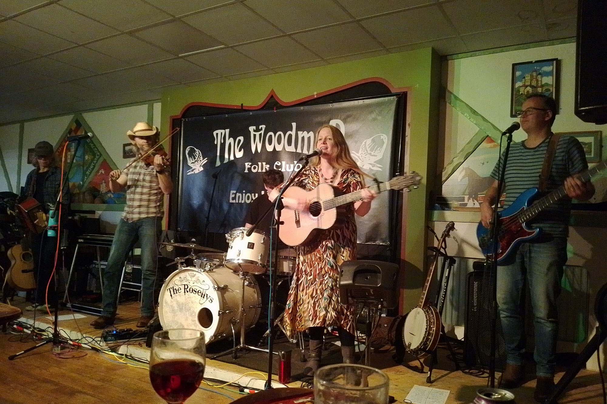 combos”’! But more of that later….. The multitudinous throng were ceremonially greeted by stunt-Bryn (aka Mr. Chris Irving), who opened the night by introducing none other than genuine Bryn who was to be our support artist for the night, and what a cracking performance he put on! We were treated to half an hour of his own songs, with a surprisingly low death count for Bryn. Just three Welshmen and a biker’s dad. Almost a happy set in the Bryndex of mortality! Suitably replete and after several failed attempts at correct band pronunciation by stunty, we moved swiftly on to the main course, a completely new act for the club in the form of The Rosellys…..and boy, did they take the place by storm! A five piece family band from the wilds of Ross-on-Wye, they treated us to a fabulous evening of mainly pretty upbeat country and Americana with even a little Cajun thrown in to spice it up a bit. The band is fronted by Simon and Rebecca Rosellys with Rebecca taking the lead on most of the vocals. Both of them are pretty mean guitar pickers and Simon doubles on fiddle while Rebecca switched to banjo for a few numbers. Again, both of them were very proficient on their second instruments. The band is completed by Simons father Allan, mainly on pedal steel guitar (another unusual sight at the club), but occasionally switching to a Cajun style accordion, Matt on bass and his son George on the magnificent drum kit. At only 18 George was indeed that teenager mentioned above but we needn’t have worried. There were to be no ‘Keith Moon’ antics here, just a perfect steady rhythm to keep the rest of the band in time. Well done George. The entire evening, both sets, were their own self-penned songs proving them to be excellent songsmiths too. Much of the material was inspired by their extensive travels and experiences in the US where they have toured and played on many occasions, notably in the southern states especially Texas. And, we were told, they were all ‘true stories’! No need to detail the entire set list but suffice to say they opened at a pace with ‘A Thousand Miles’ and didn’t really slow down until they got to ‘Innocent’ half way through the set. ‘Lafayette Louisiana’ brought the first taste of Cajun and in other types of venue folks would have been on their feet dancing without a doubt. The rest of the set was just superb but one of the highlights for me was the opening number of the second set after the break which they performed stripped back to the duo of just Simon & Rebecca. It was called ‘Heartaches and Promises’ and was very reminiscent of Gillian Welch & David Rawlings in style and performance…simply brilliant. The remainder of the second set too was a gorgeous mix of mainly fairly upbeat numbers, especially the very rocky ‘Electrified By You’ half way through the set, with an occasional slightly slower one inserted just for good contrast. We were warned of the dangers of strong liquor in ‘Don’t Let The Whisky Win’ and of misusing drugs with ‘Cocaine Train’. Having had their four month old latest band member with them they were understandably keen to finish their second set bang on time BUT we did manage to coax an encore in the form of ‘Queensland Sky’ and an excellent evening was completed in fine style. If only the cheese cobs had been replaced by Jambalaya and Filé Gumbo we could truly have been in a roadside bar in San Antonio…and I fully expected to see ‘gators on the banks of the cut when we emerged into the cold night air of Kingswinford! Another Woodman triumph without any doubt and here’s to the next time that we are privileged to welcome The Rosellys. |