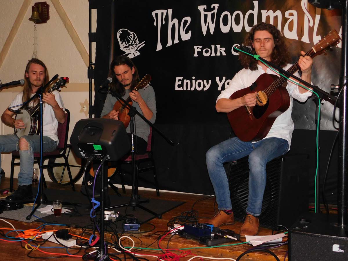The Trials of Cato perform a mix of original and traditional material. Now to the ‘meat’ of the review … It surprisingly transpired during the evening that The Trials of Cato’s first experience of folk festivals was The Wirral, earlier this year. That immediately explained something that had puzzled me and the other travelling Woodmanites present in the bar at The Wirral when they performed – we wondered, “Why only the bar?”. To Debby and Derry folk festivals are, in part, scouting missions. When they asked what we thought, the immediate consensus was, “Book them”! So, they did. History will almost certainly record that this was a bit of a coup. The Trials of Cato will go on to be very big in the folk world, and we got them early on! Well done Derry and Debby. I have a slightly odd theory that you can tell a lot about an act from the way they set up. The Trials of Cato have further reinforced that theory. Their sound check was painstakingly thorough, and reflected the precision with which these guys would perform. Throughout their set, there was not a string on any instrument that wasn’t in perfect harmony, and they play quite a lot of instruments! They are instrumentally and vocally perfectly balanced and very together. Whilst their manner on stage is easy and relaxed, this band has definitely put in the hard miles in terms of rehearsals. So, what’s the aim of a review? Are you looking for a set list? I have one, but suffice it to say they provided a varied mix of original material and traditional, plenty of tunes and some excellent songs, including one sung in Welsh. Heads were bobbing and feet tapping throughout. Clapping in time had broken out by the time we got to a well-deserved encore! Want to know what they said between songs? Sorry, no spoiler alerts here! The chat was easy, though I will say they feel one of their weaknesses is that they struggle to think of titles for their tunes. This point was well illustrated by the introduction of the encore tunes … “The E set / well actually it’s the D set on capo 2”. With a CD due out next spring, there may be naming opportunities up for grabs – the chance to say, “That’s one of mine” when it comes out, perhaps? Want to know if they’re worth going to see? I will just say this … if you weren’t there, go and see The Trials of Cato as soon as you get the chance. All three are accomplished musicians. It’s easy to major on lead instruments when you hear mandolin, bouzouki and banjo played as crisply as Robin and Will manage it; however, do take the time to look at the fretboard acrobatics of Tomos while he provides the driving guitar rhythm. Incidentally, on the subject of details, Will’s feet are worth watching! The evening had opened with Dick Woodhouse doing what he does best – making us laugh. Closer than ever to the original sound, on his crisp sounding new classical guitar, he gave us a couple of Jake Thackray songs – ‘Grandad’ and the ‘The Blacksmith and the Toffee maker’. John Hoare followed with Ralph McTell’s ‘Peppers and Tomatoes’, and Anthony John Clarke’s ‘The Broken Years’, the latter providing the large audience with the chance to warm up its vocal chords. As usual, Bryn Phillips was MC for the evening, and he opened the second half with a couple of fishing related songs. When the club sits on a canal, you don’t need a reason to do fishing related songs, do you? The first was a bitter-sweet song called "Breakdown" and the second of his songs, ‘Better Never to Kiss a Fish’, was a hilarious and newly-penned offering based on the recent story of a fisherman who nearly died after swallowing a fish, yes you guessed it, that he was kissing! Well done again Debby and Derry – another of those ‘special’ nights at The Woodman. |